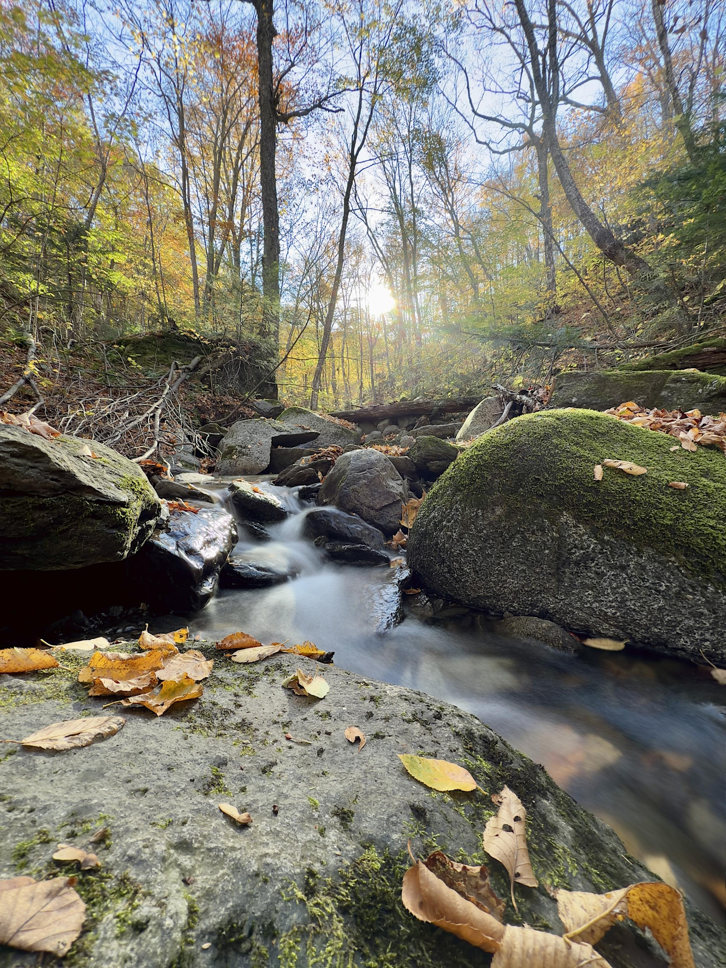 Une rivière en pause longue avec des rochers et des arbres à contre-jour