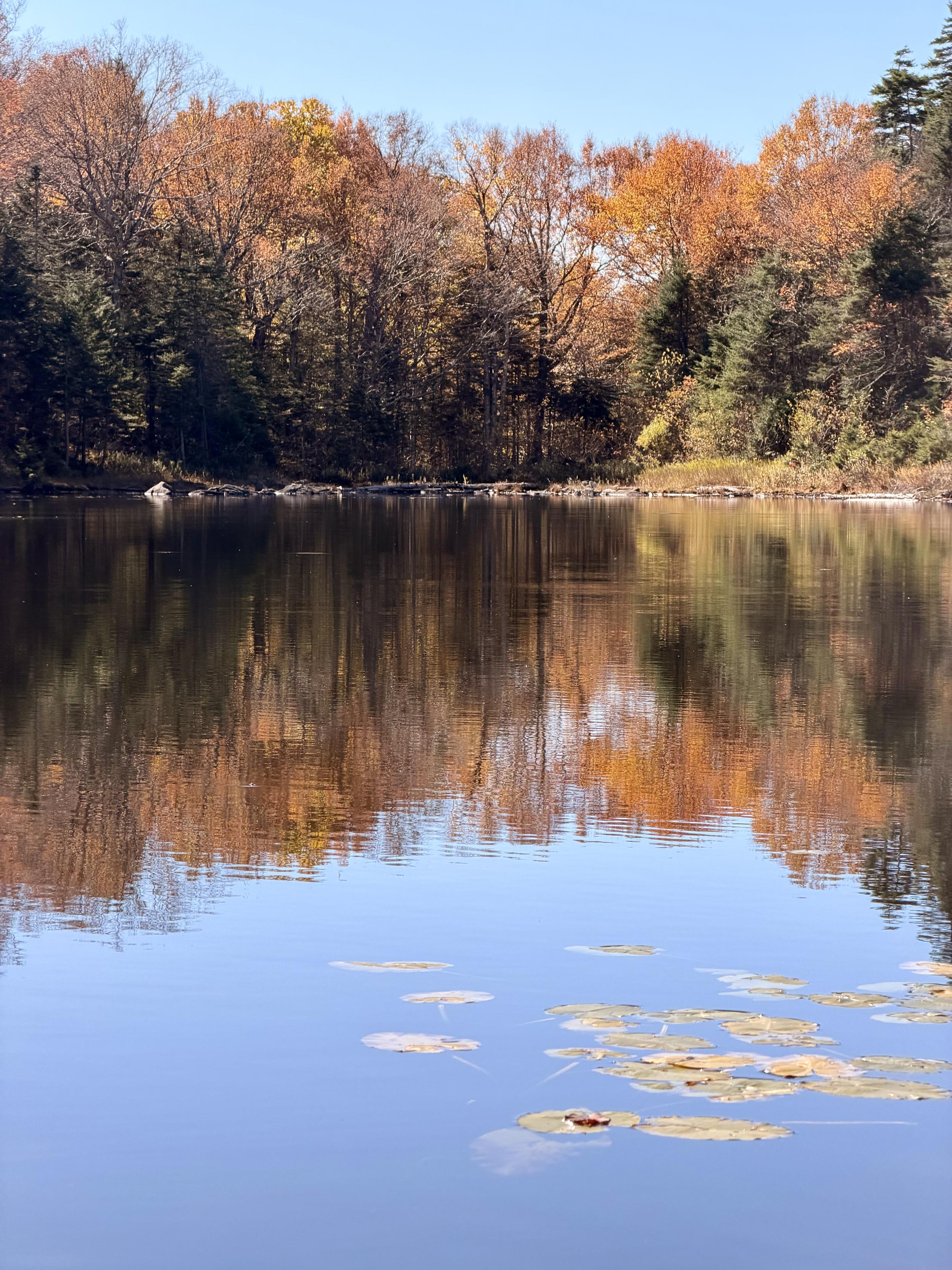 Un lac avec des nénuphars au premier plan et des arbres aux couleurs d’automne au fond.
